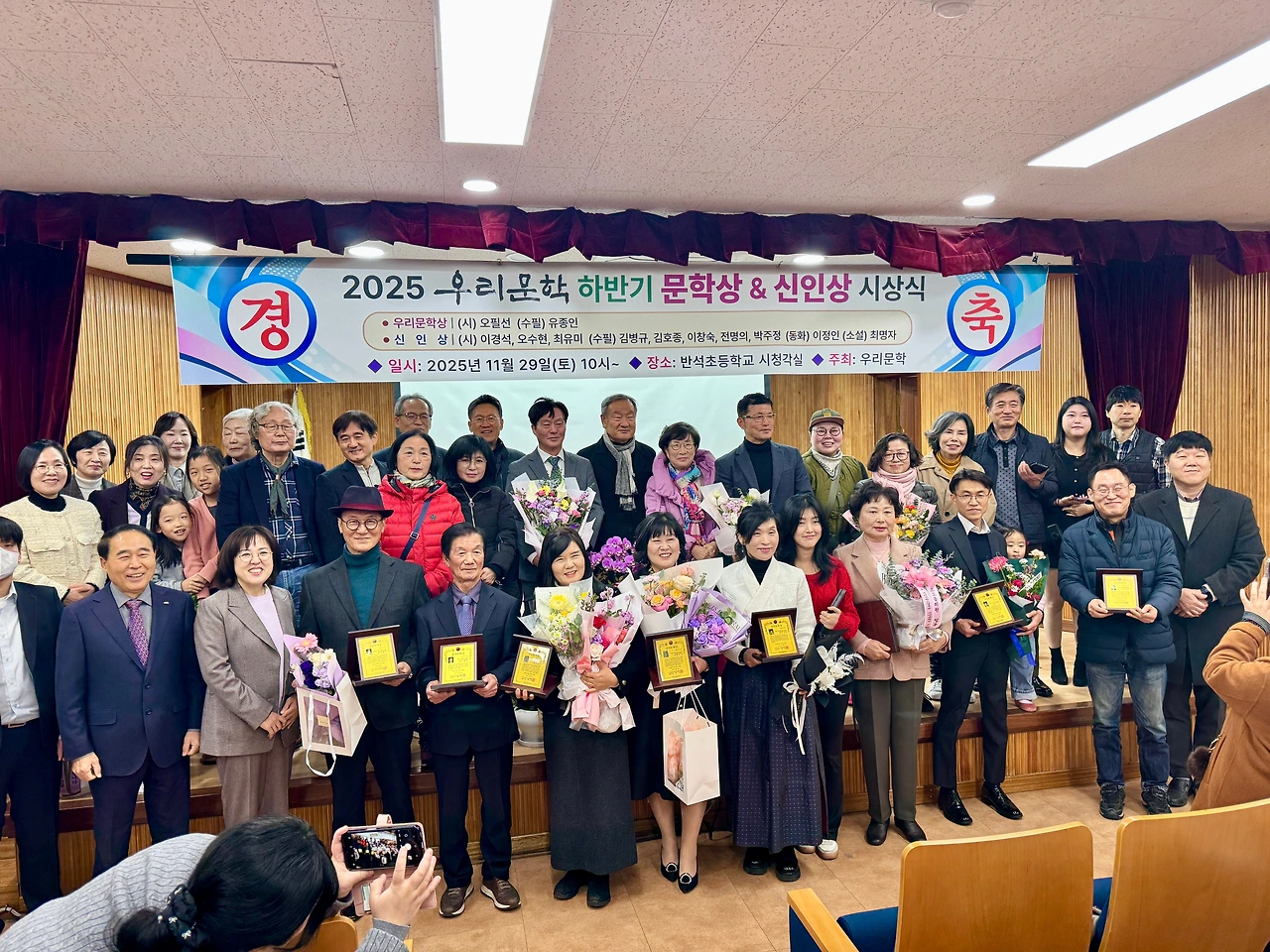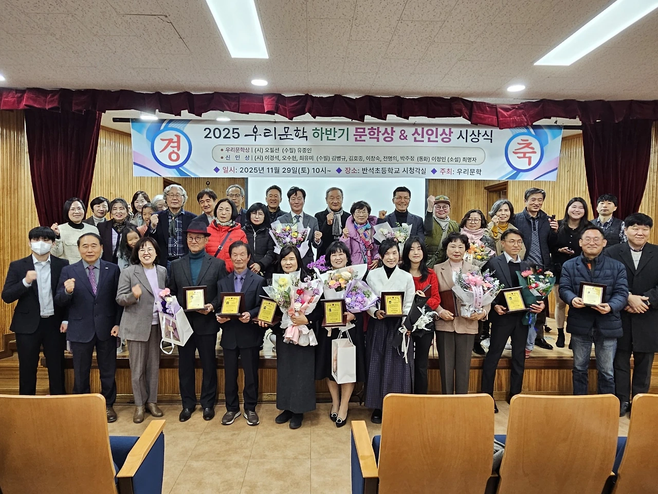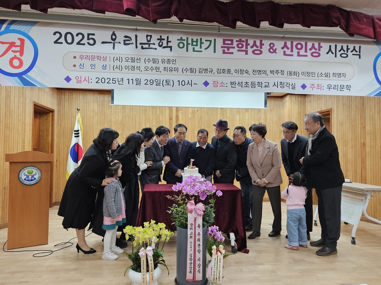 「우리문학」하반기문학상시상식및출판기념회참석자들이단체기념촬영하고있다. 우리문학(회장권태주)은지난29일「우리문학」겨울호를출간하고,반