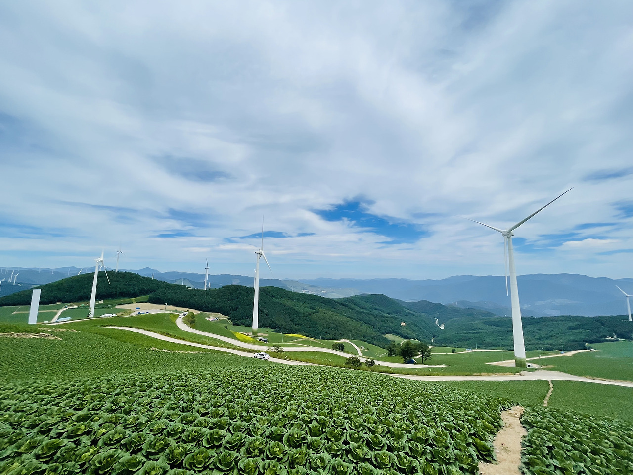 산양목장에서 조금 더 올라가면 보이는 바람의 언덕도 장관이다. 특히 고랭지 배추 농사가 한창일 때는 언덕 전체가 신선한 녹색이다. 입이 쩍 벌어질만한 규모의 배추들의 향연으로 그 자체가 광활한 풍경이다. 이 많은 배추를 층층이 이동하며 심었을 이들의 노고를 생각하면 아찔한 생각마저 든다. 인적이 드문 틈을 타 슬쩍 마스크를 내려보면 배추 냄새가 콧속으로 훅 들어온다. 언제까지고 코를 킁킁대며 맡고 싶은 달큰한 향이다.