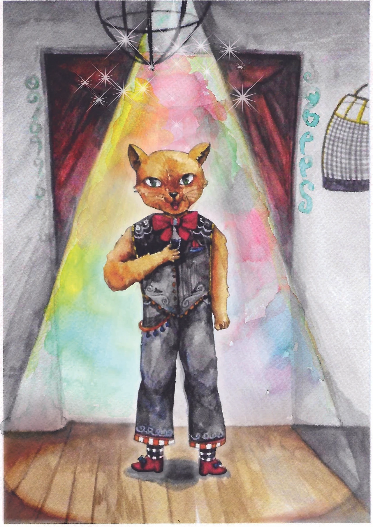 족제비는 하얀 장갑을 끼고 빨간 조끼와 파란 바지를 입고 있었다.