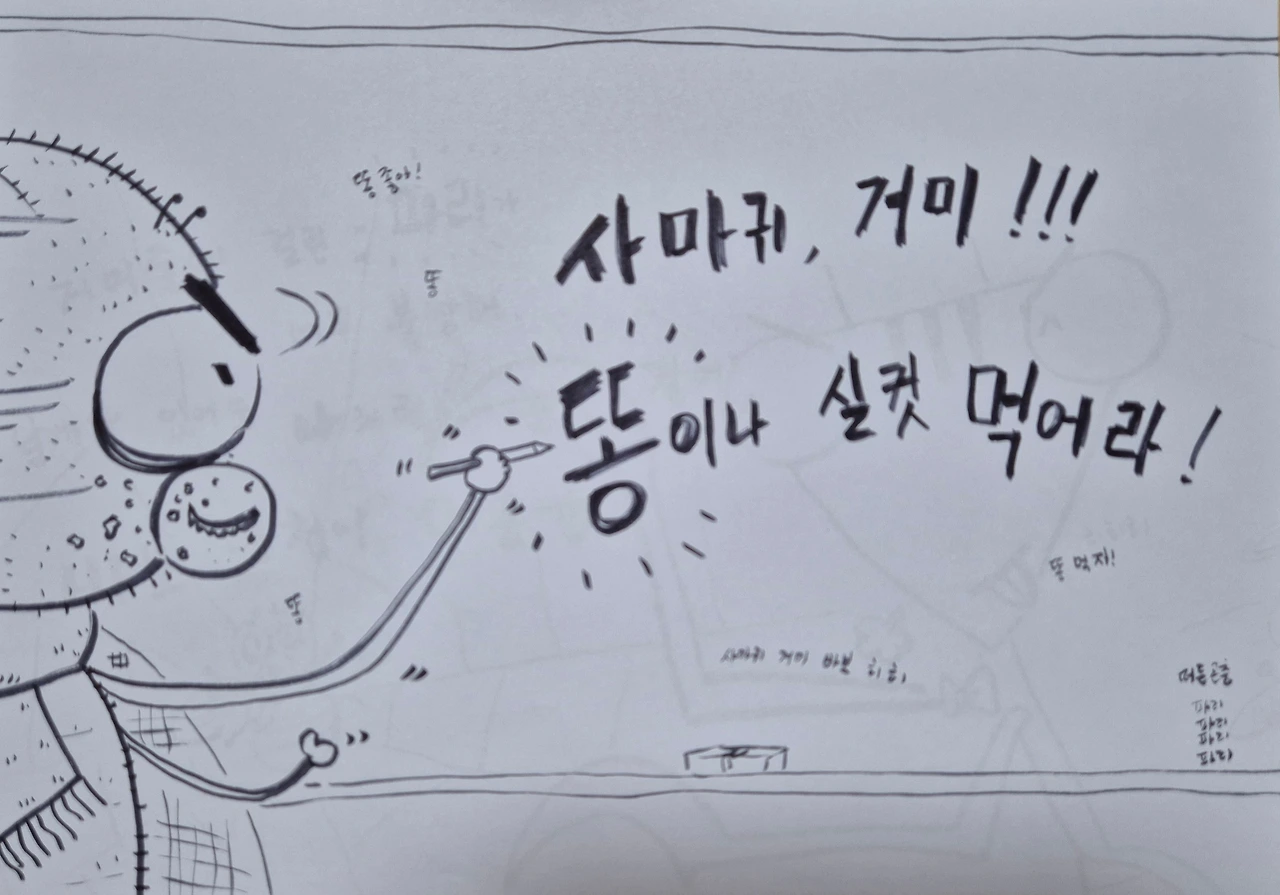 하고 말한 파리가 주머니에서 똥을 꺼내 꿀벌과 나비를 향해 던졌어요.