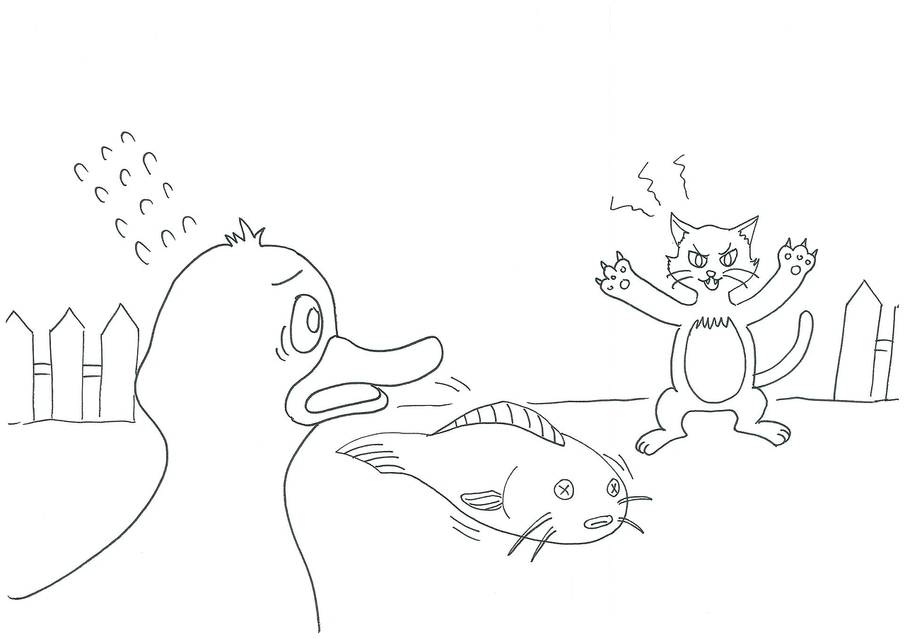 하이디(오리)는 코코(고양이)에게 물고기를 빼앗기지 않는 방법을 알았어요.