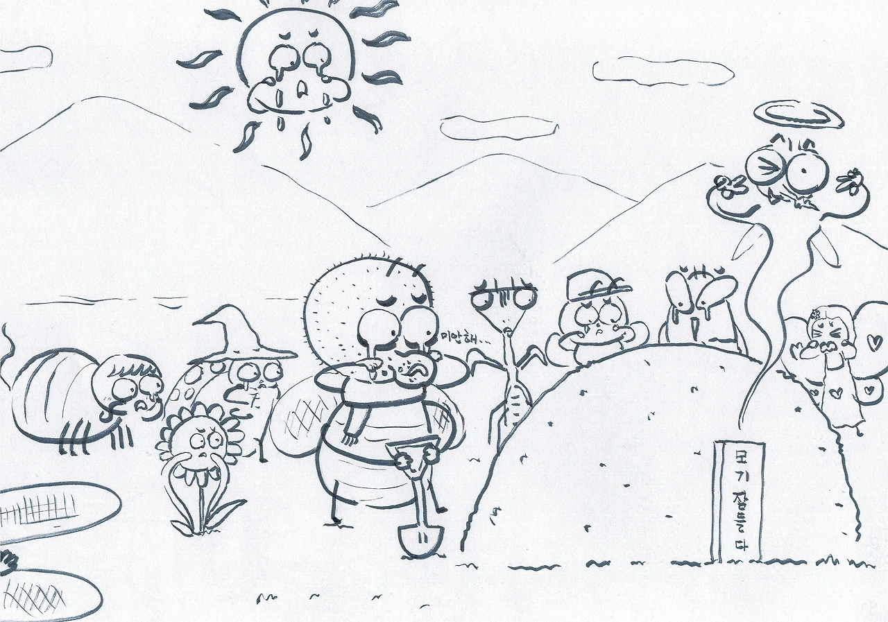 죽은 모기 묘비 앞에는 모기들이 많이 날아왔어요.