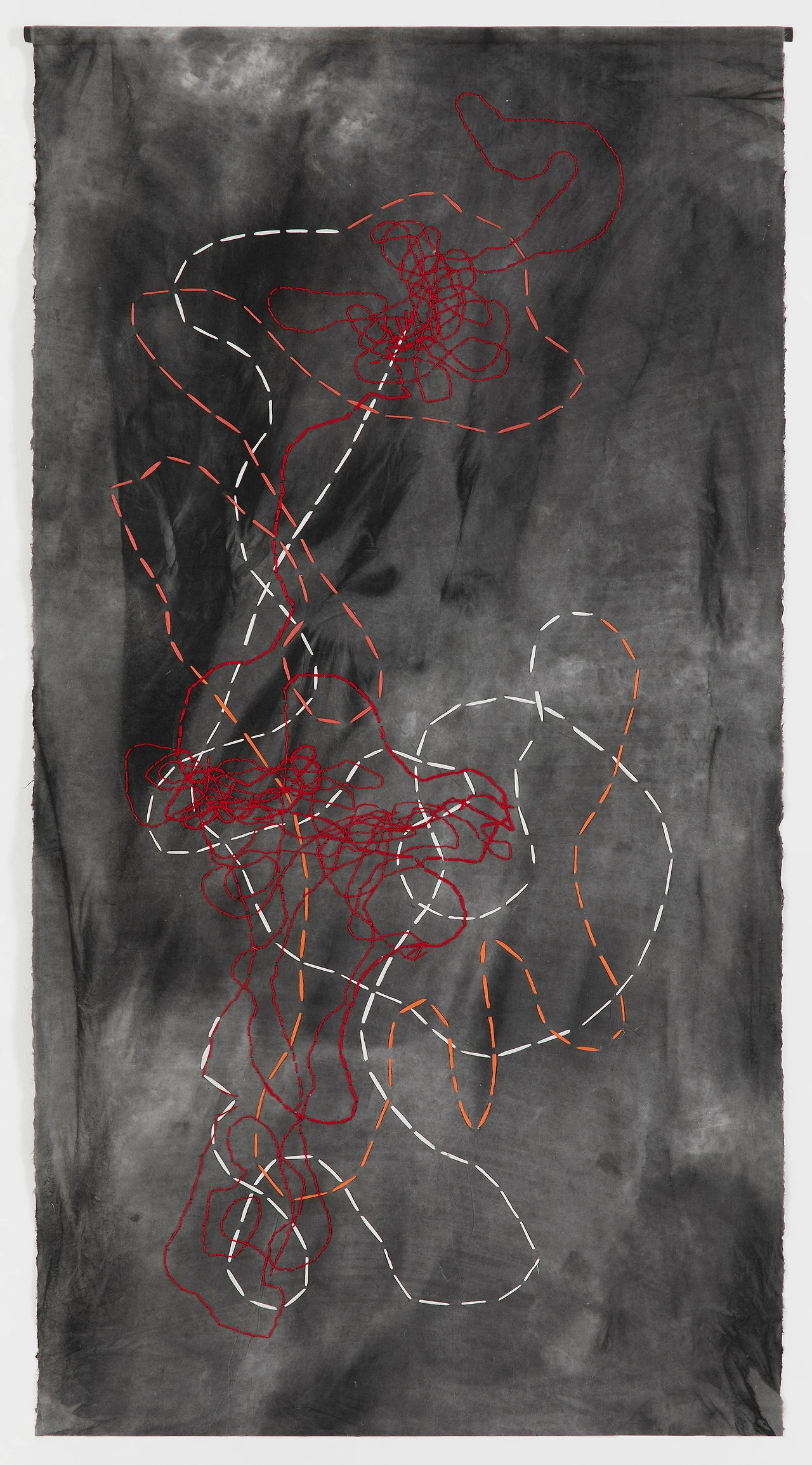작가는 작품명(lines of my life)에서 보듯 자신의 삶과 연계된 인생길을 장지 위에 수놓고 있다.