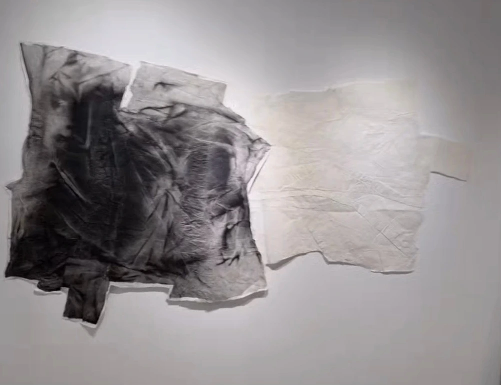 "한쪽은 얇은 순지를 먹으로 염색해서 찢고 재봉틀로 엉겨 붙이게 이어가고 다른 한쪽은 순지 그대로 찢고 붙이고 다시 찢고 붙여서 형태는 무너졌지만 남기고 싶은 부분이었어요."