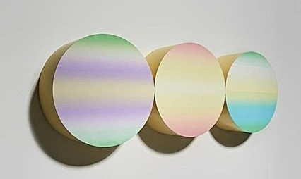 이 작품은 점 선 면의 관계가 네모 세모 원(동그라미)를 생성하며 빛과 색채의 관계를 유지한다.