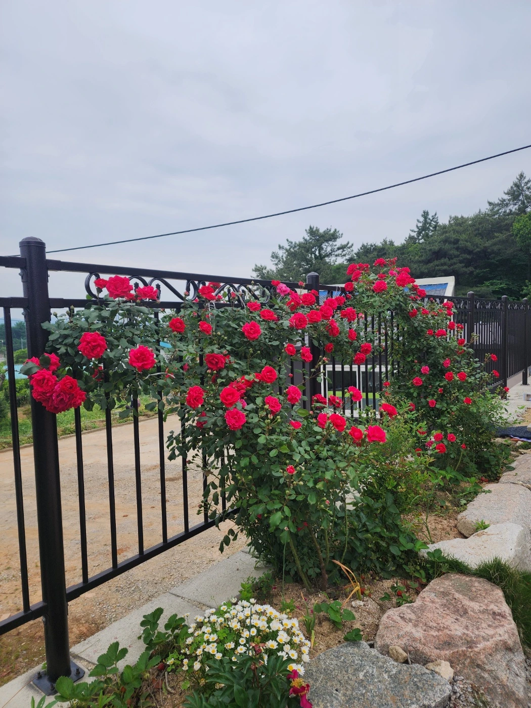 무당벌레는 동수네 집 담장 너머 장미꽃을 발견하고 날았어요.