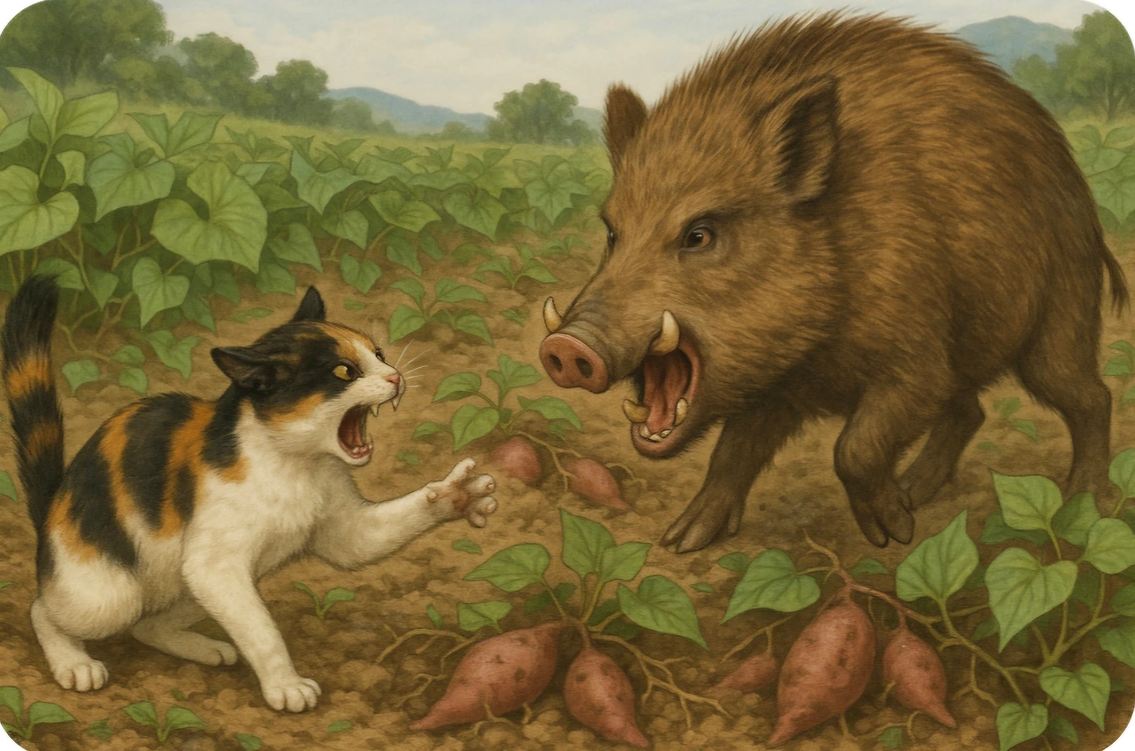 동수네 고구마밭에서 고양이와 멧돼지의 싸움이 시작되었어요.