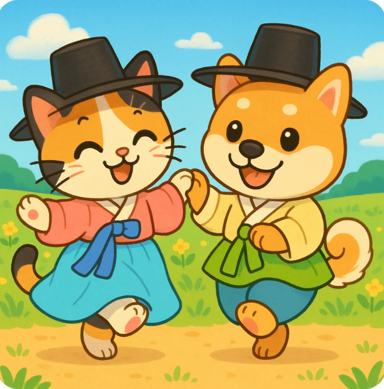 갓 쓴 개와 고양이가 들판에서 춤춘다는 소문이 퍼졌어요.