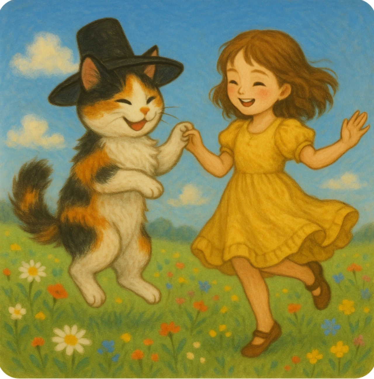들판에서 갓 쓴 고양이와 춤추던 꿀벌과 나비가 날아갔어요.