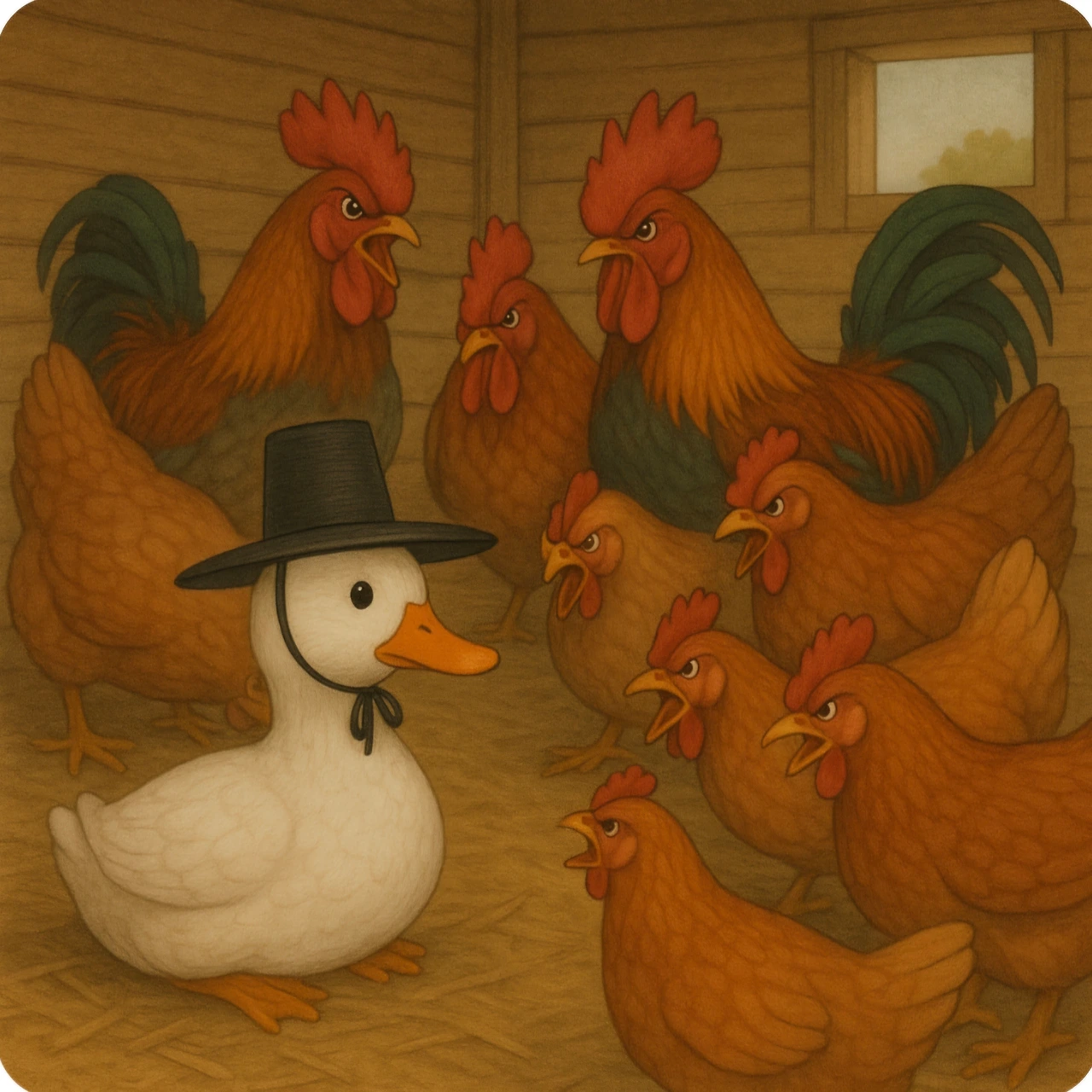 그곳에 살던 갓 쓴 오리 <프리덤>은 닭들에게 왕따를 당했어요.