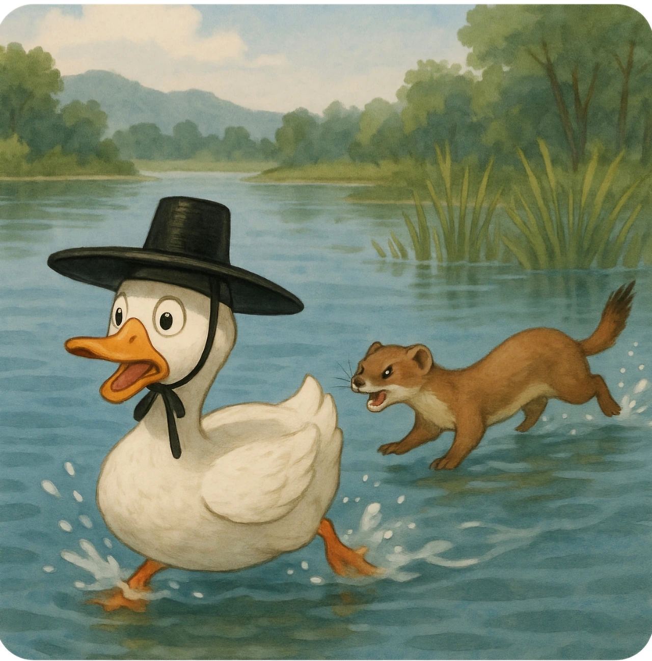 배고픈 족제비는 계속 오리를 쫓았어요.