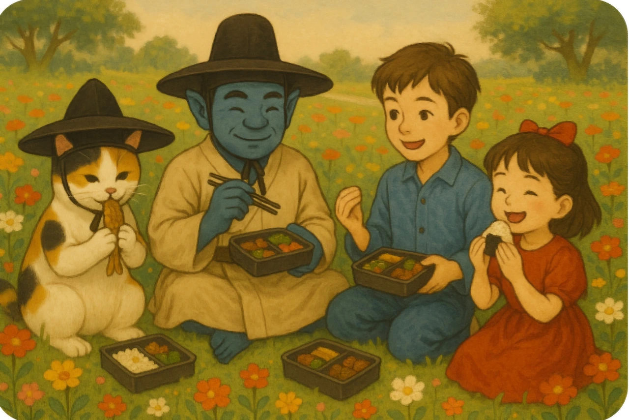 도깨비와 친구들은 맛있는 도시락을 먹었어요.