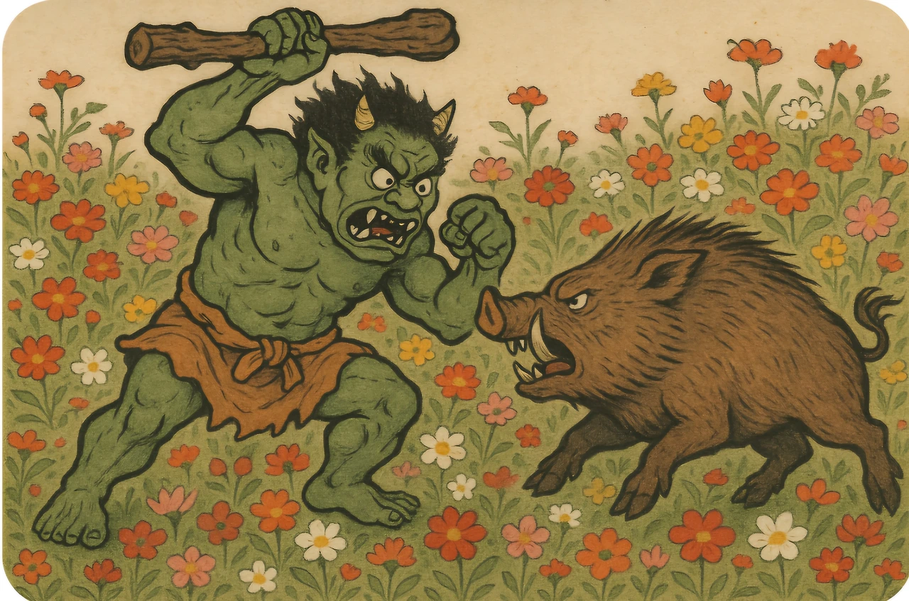 멧돼지는 소리치며 도깨비를 향해 달렸어요.