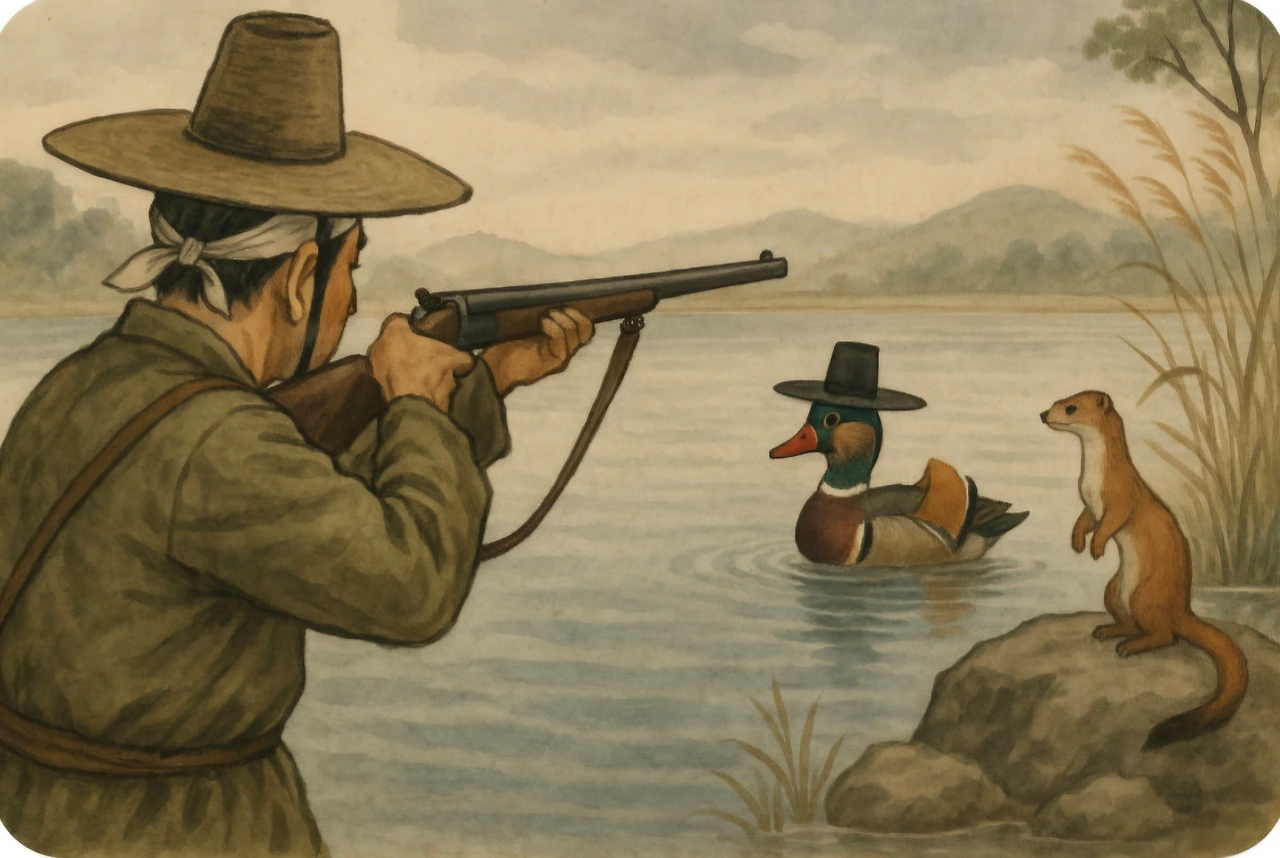 청둥오리와 족제비를 향해 총구를 겨눴어요.