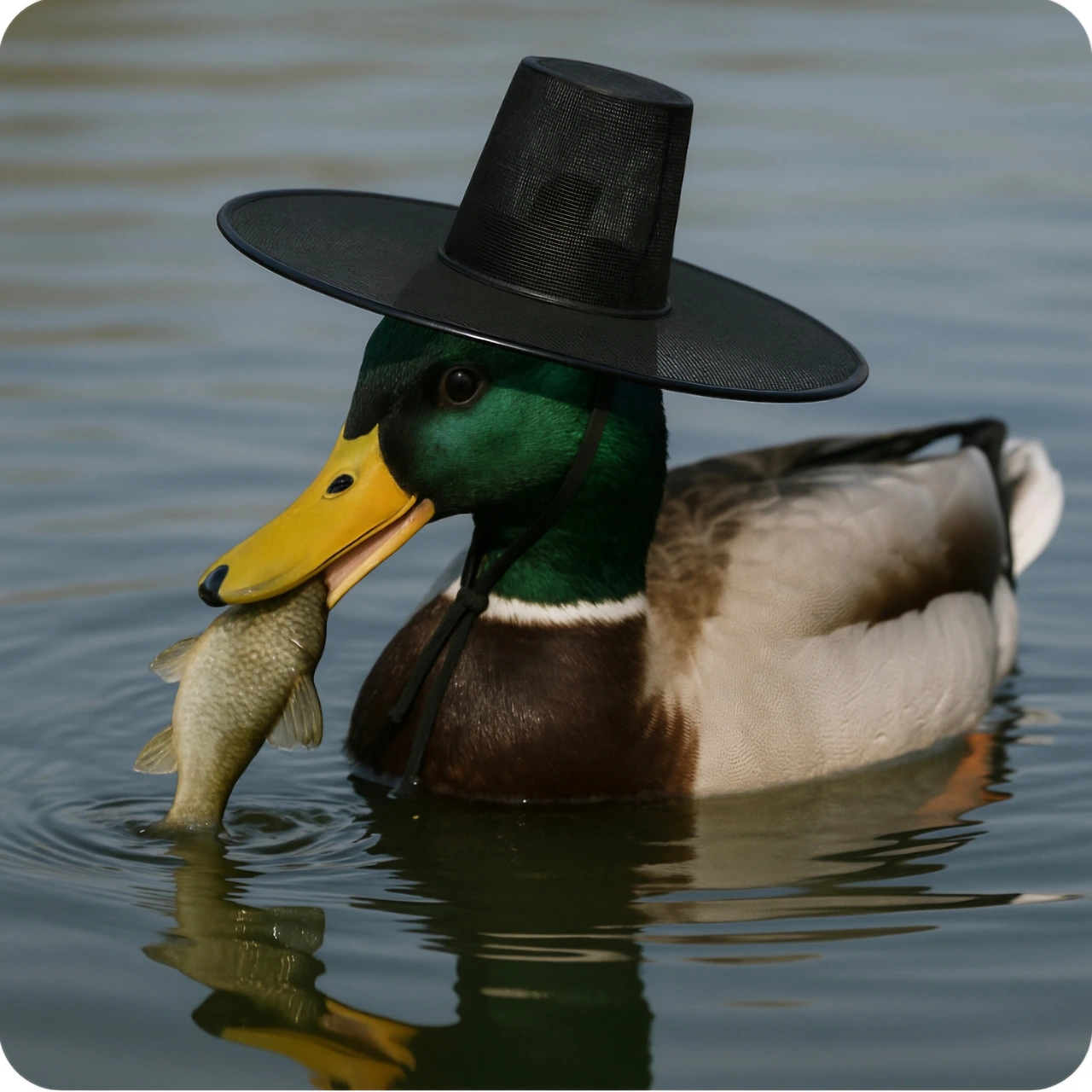 오늘도 갓 쓰고 호수에서 놀고 있는 청둥오리 <쿠쿠>에게 다가가 갓을 한 번만 쓰고 싶다고 말했지만 소용없었어요.
