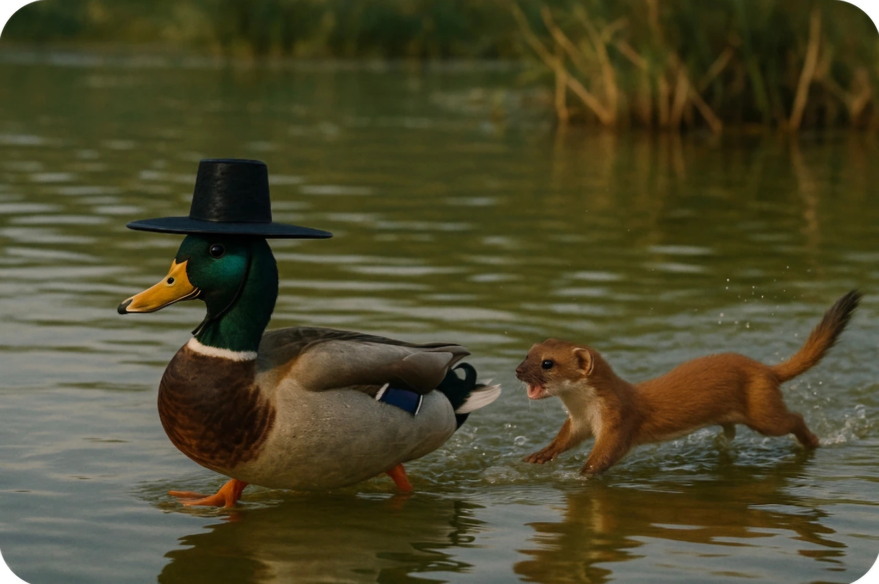 갓 쓴 오리 <프리덤>과 청둥오리 <쿠쿠>는 호수를 돌며 족제비를 찾았어요.