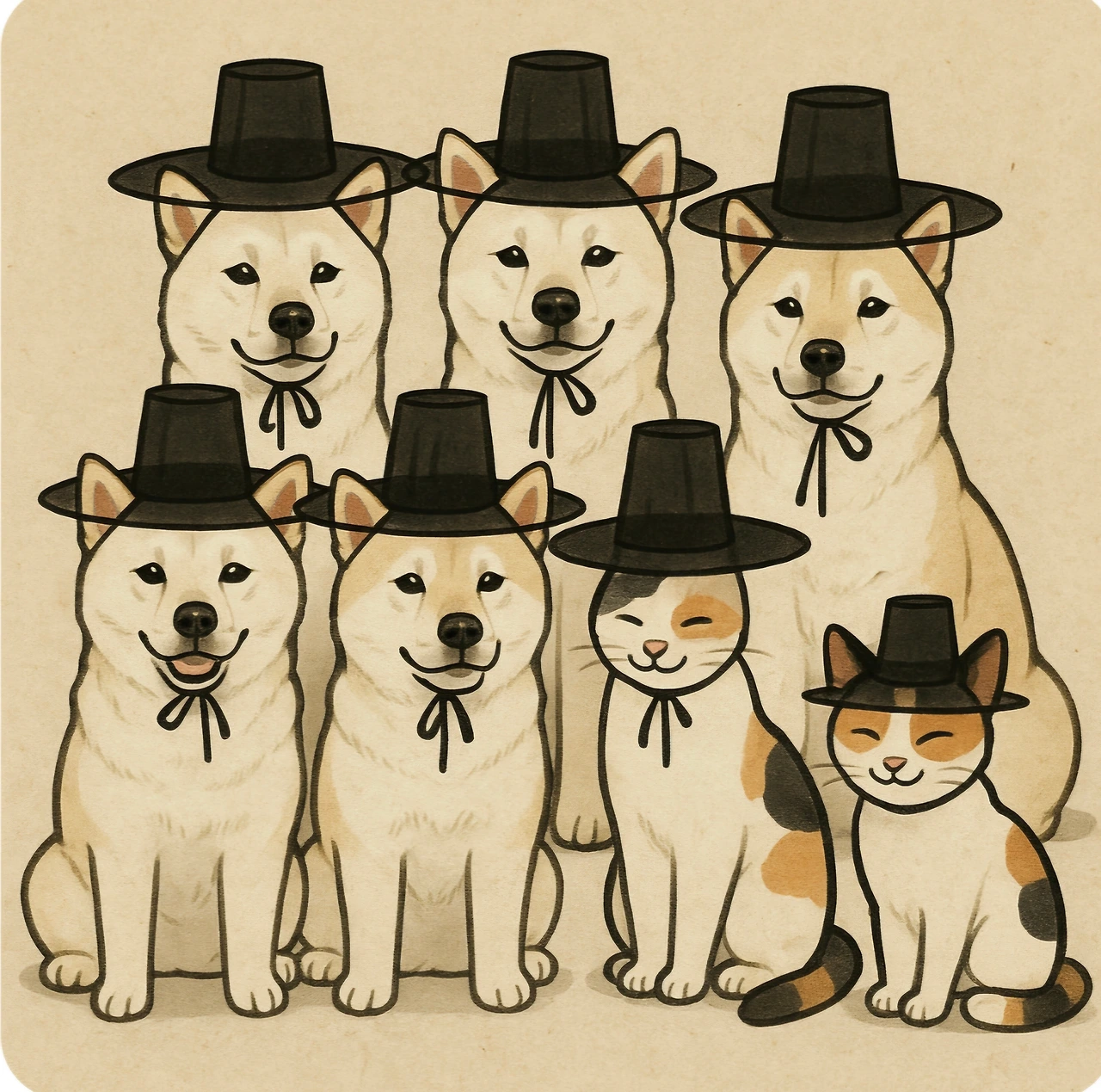 사진 찍기 전에 <나비>가 둔갑술을 이용해 개 두 마리를 고양이로 둔갑시킨 거였어요.