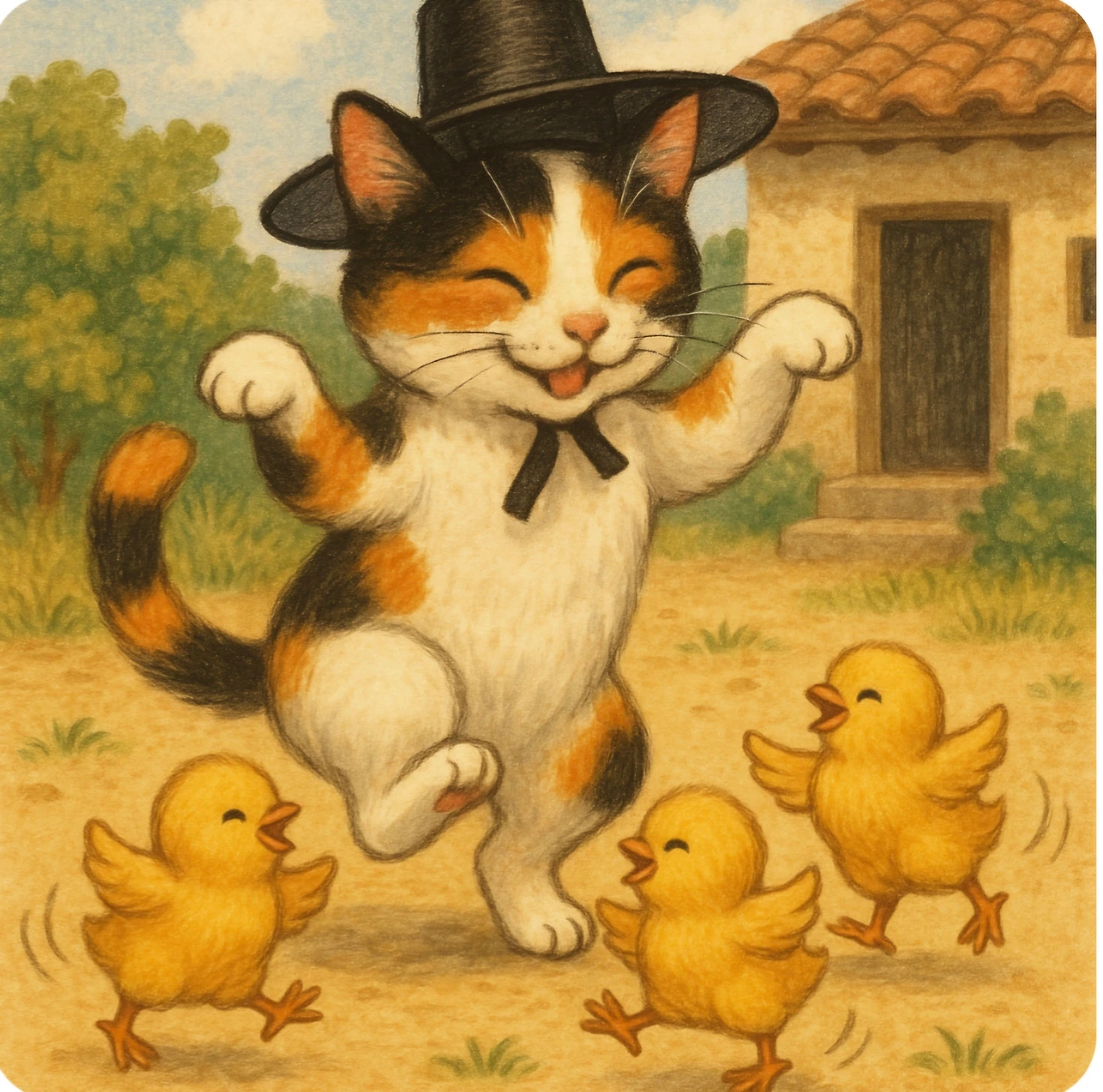 들판에 놀러 왔다 고양이와 병아리들이 춤추는 걸 보고 침을 꿀꺽 삼켰어요.