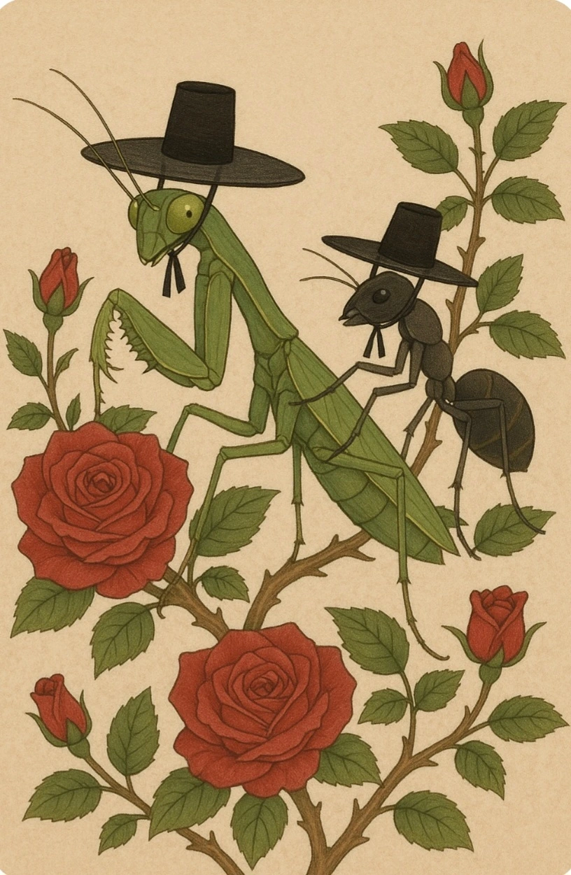 갓 쓴 사마귀와 갓 쓴 일개미는 장미넝쿨을 옮겨 다니며 꽃향기를 맡았어요.