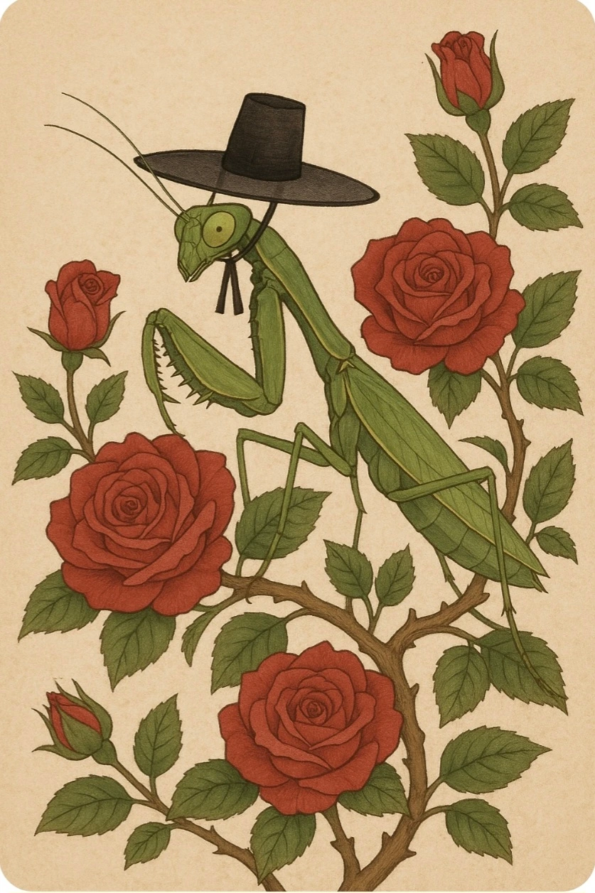 갓 쓴 사마귀는 돌아다니며 장미꽃 향기를 맡았어요.