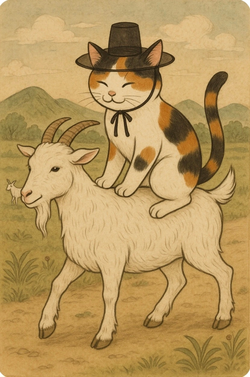 염소가 하얀 고양이를 등에 태우는 걸 싫어하는 것 같았어요.