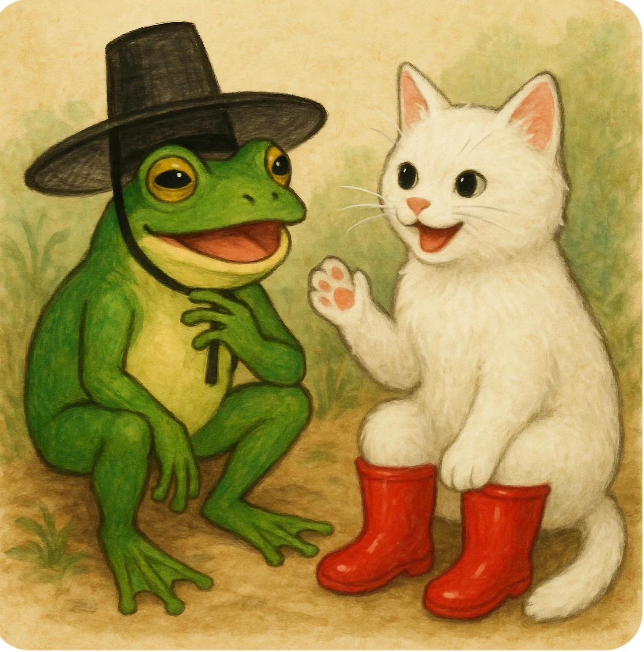 갓 쓴 청개구리 <단단>은 외줄에 올라가는 <하니>를 지켜봤어요.