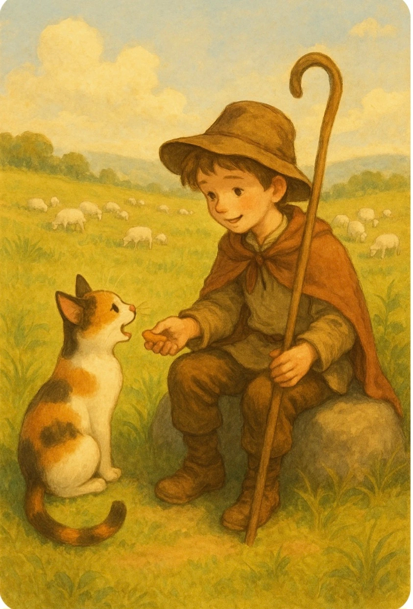 양 떼가 안전하게 풀을 뜯어먹고 있는 걸 지켜보던 목동 <준수>가 나무 그늘 아래 앉으며 삼색고양이 <부비>와 눈이 마주쳤어요.