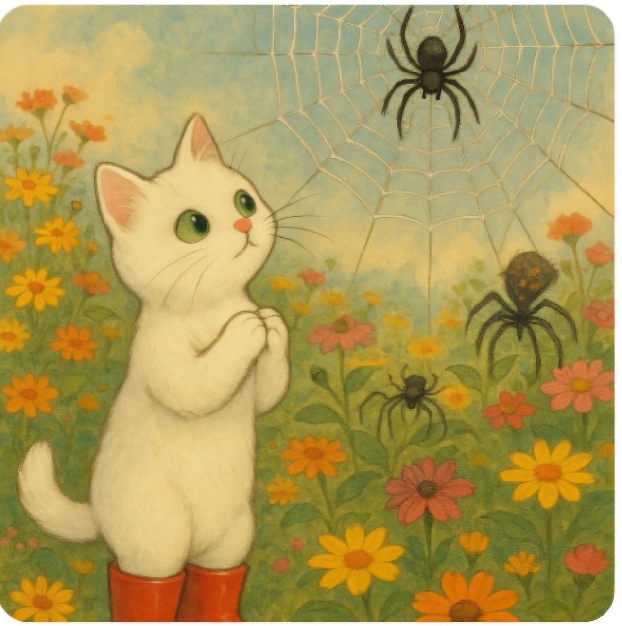 대왕거미 <키키>는 꽃밭에 거미줄을 치고 있었어요.