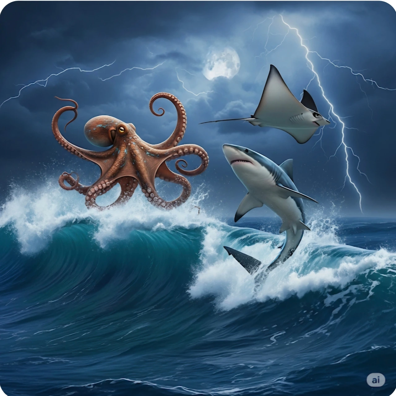 폭풍우가 몰아친 바다에는 대왕문어, 상어, 가오리 뿐이었어요.