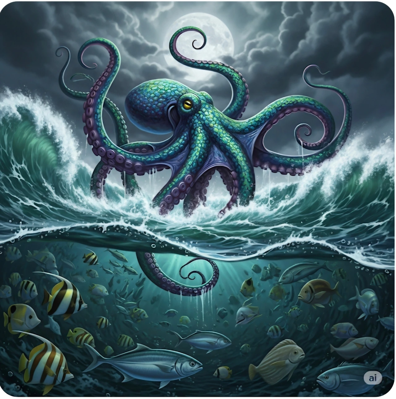 지구의 행성에서 칠십(70)% 이상을 차지하는 바다의 대왕은 문어였어요.