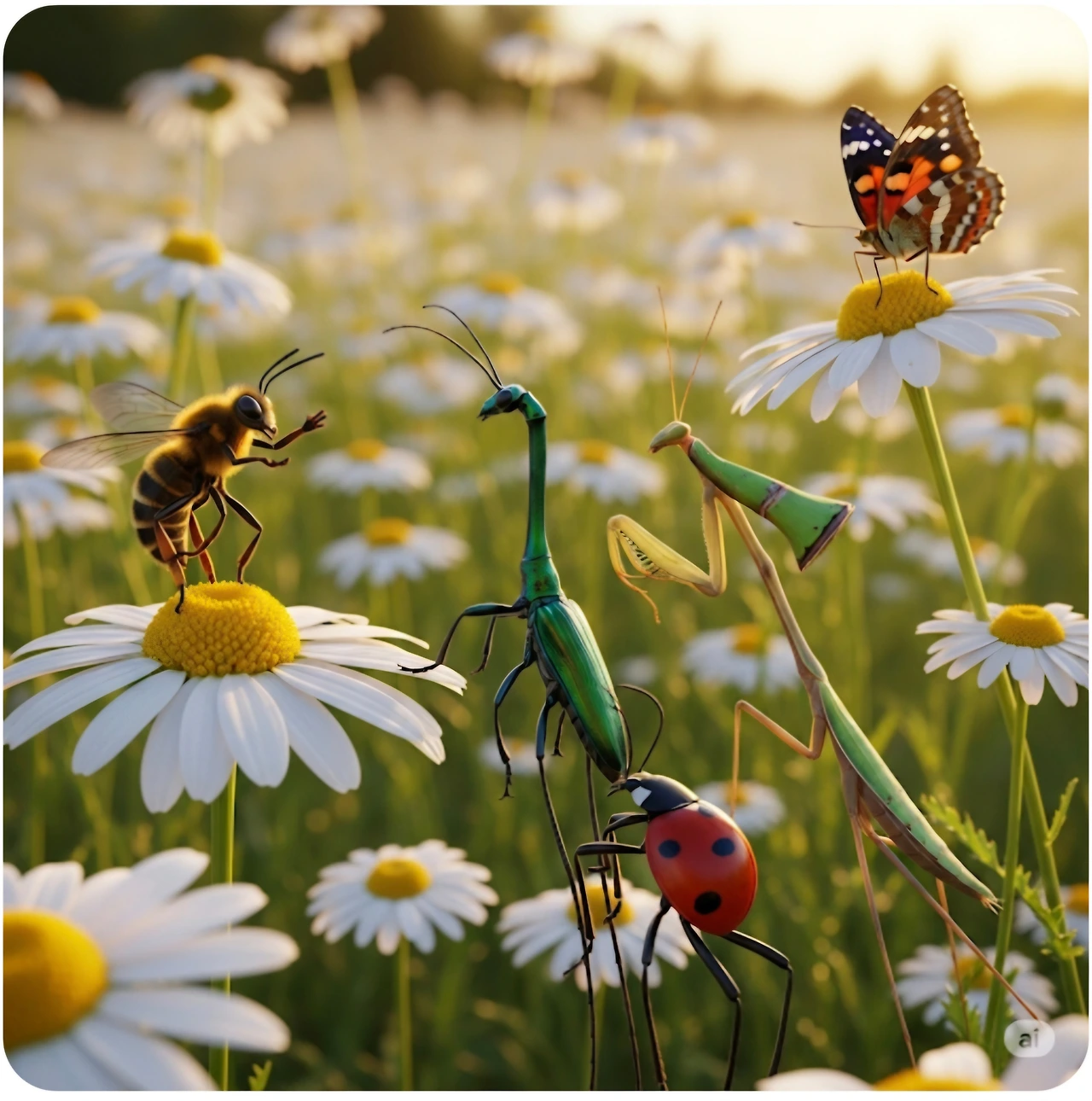 데이지꽃밭에 사마귀, 무당벌레 나비가 찾아왔어요.