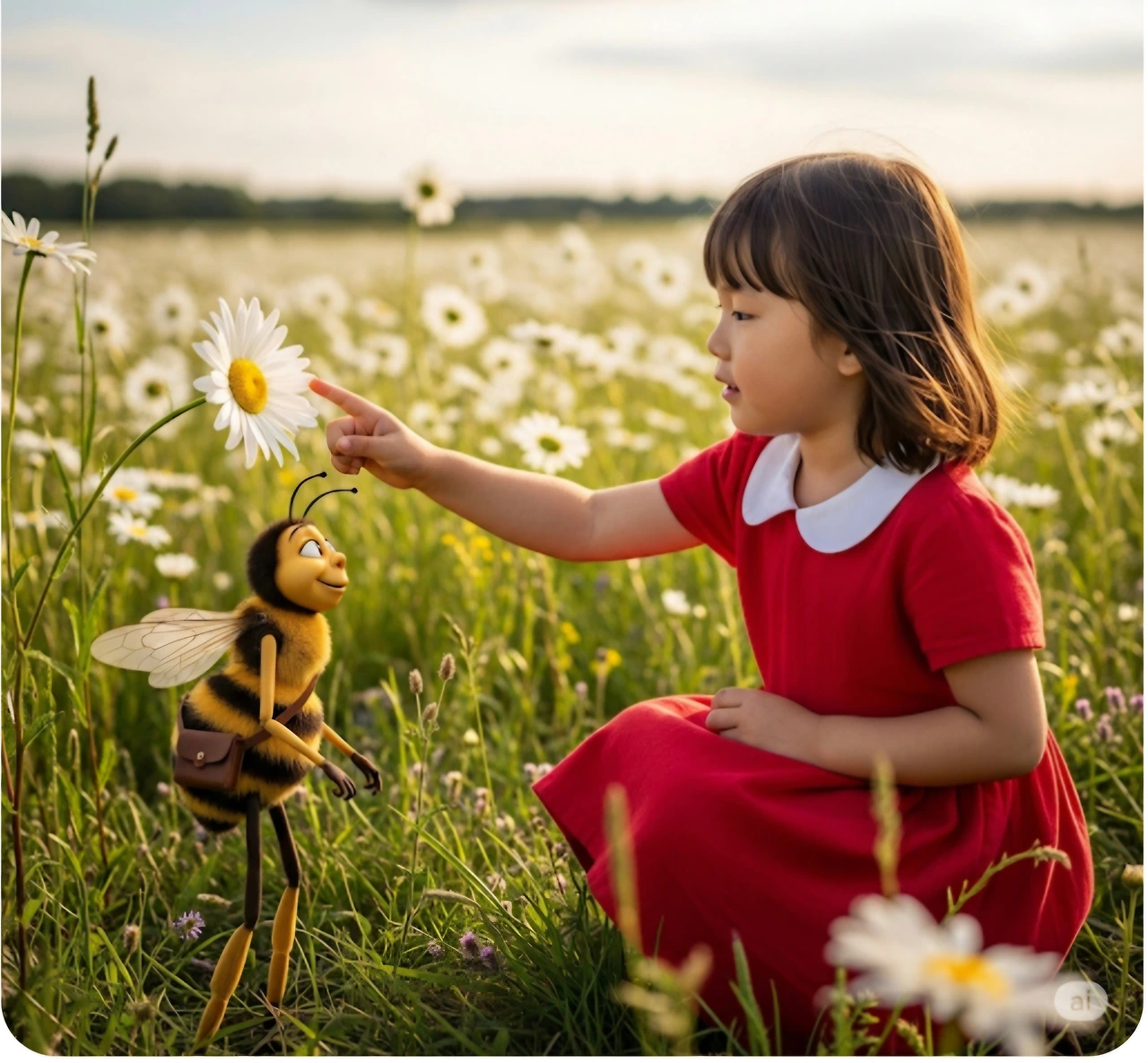 다리 긴 꿀벌은 소녀의 이야길 듣고 데이지꽃 열두 송이 꽃다발을 주었어요.