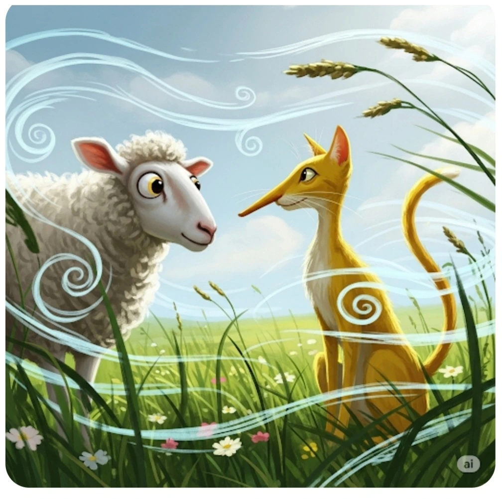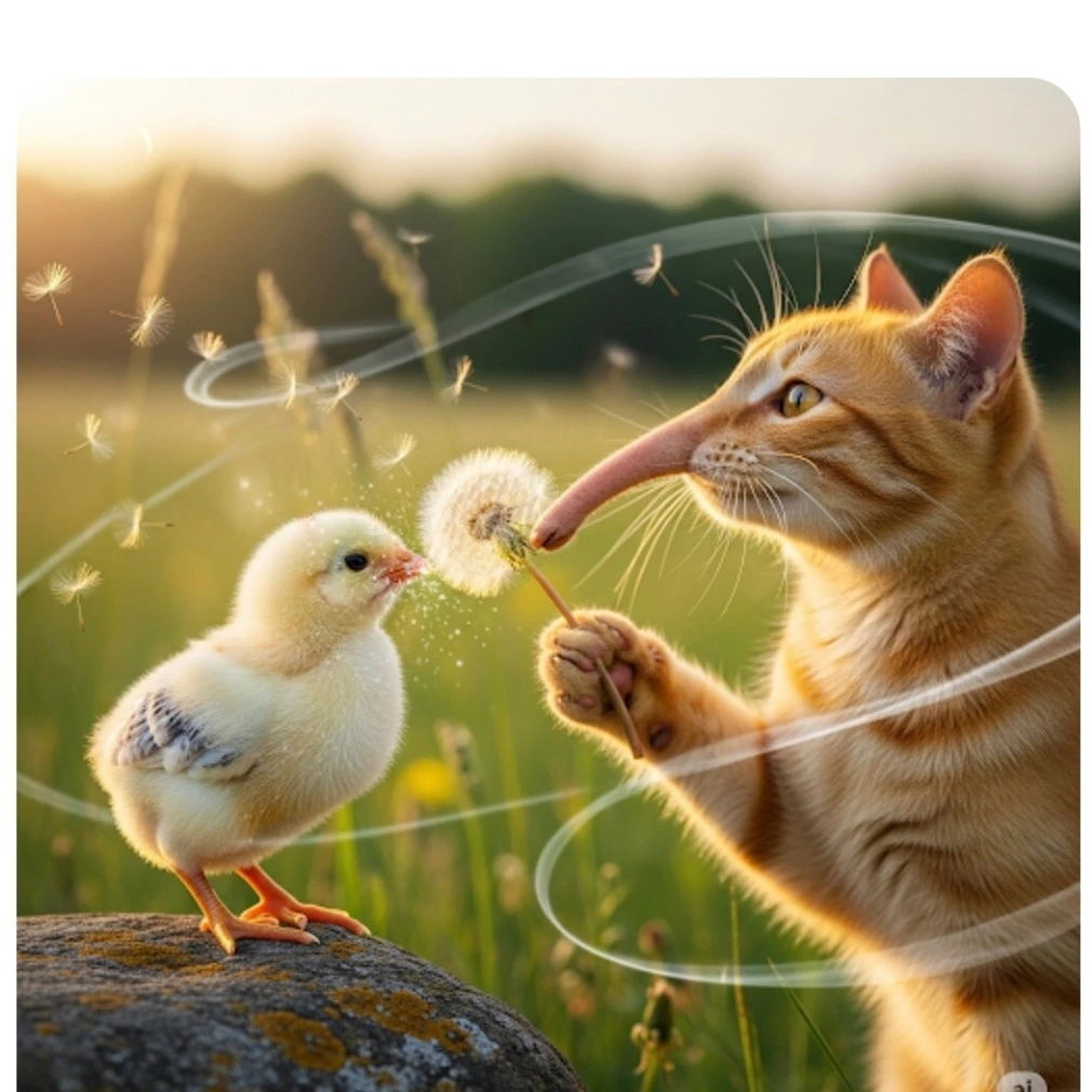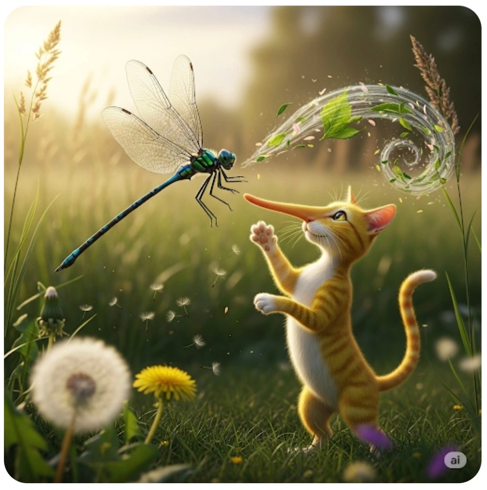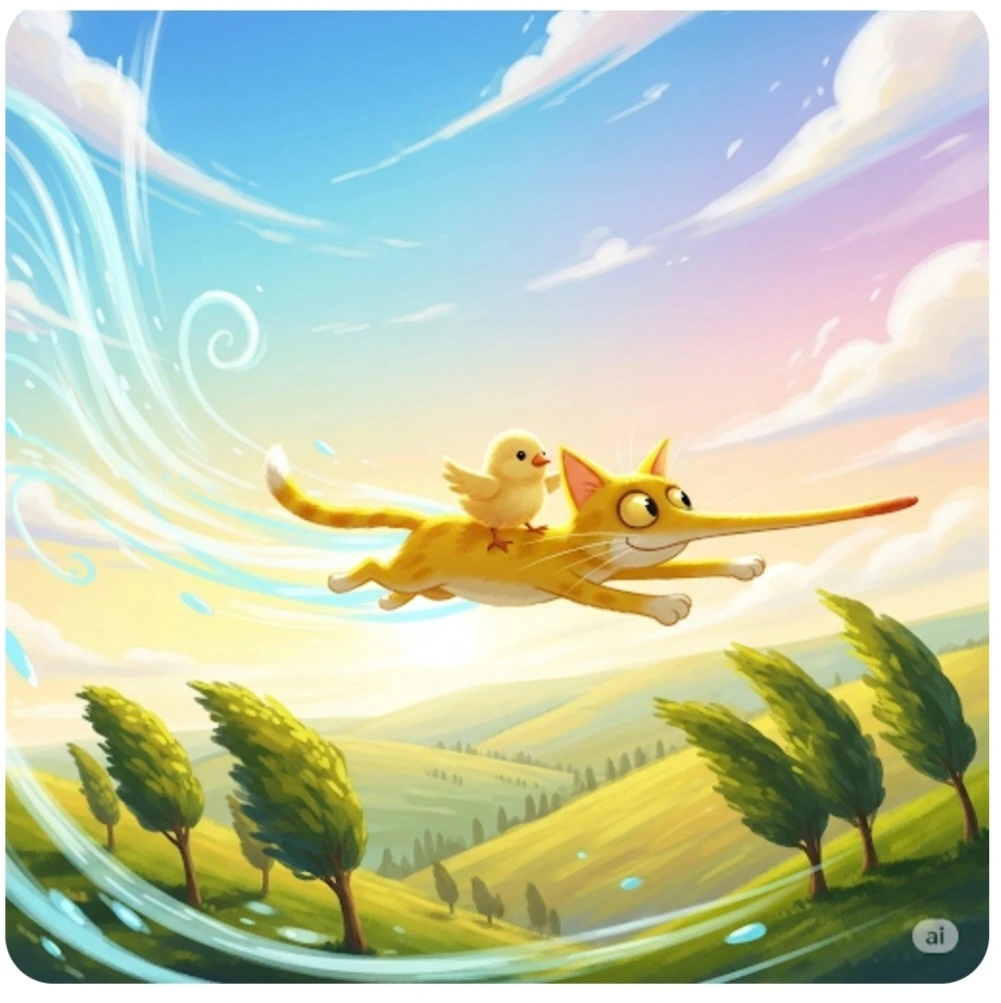 코가 긴 고양이는 바람이 불자 사뿐히 바람 위에 올라탔어요.
