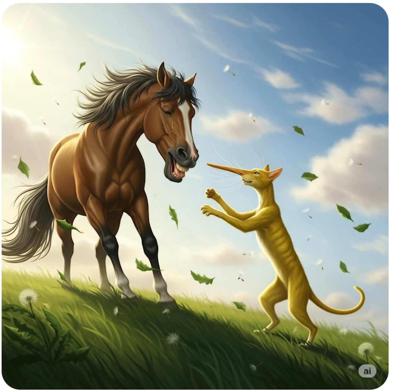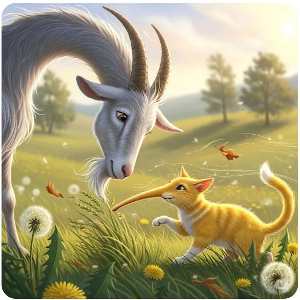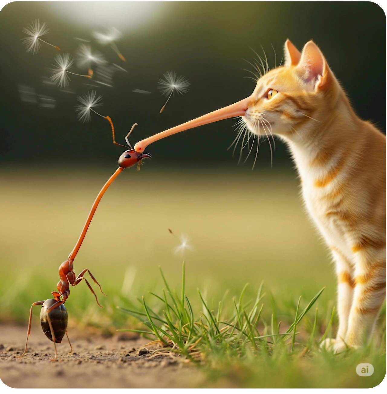 코가 긴 고양이는 개미에게 인사하고 달렸어요.