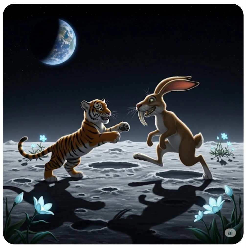 지구에서 호랑이는 토끼를 기다리고 있었어요.