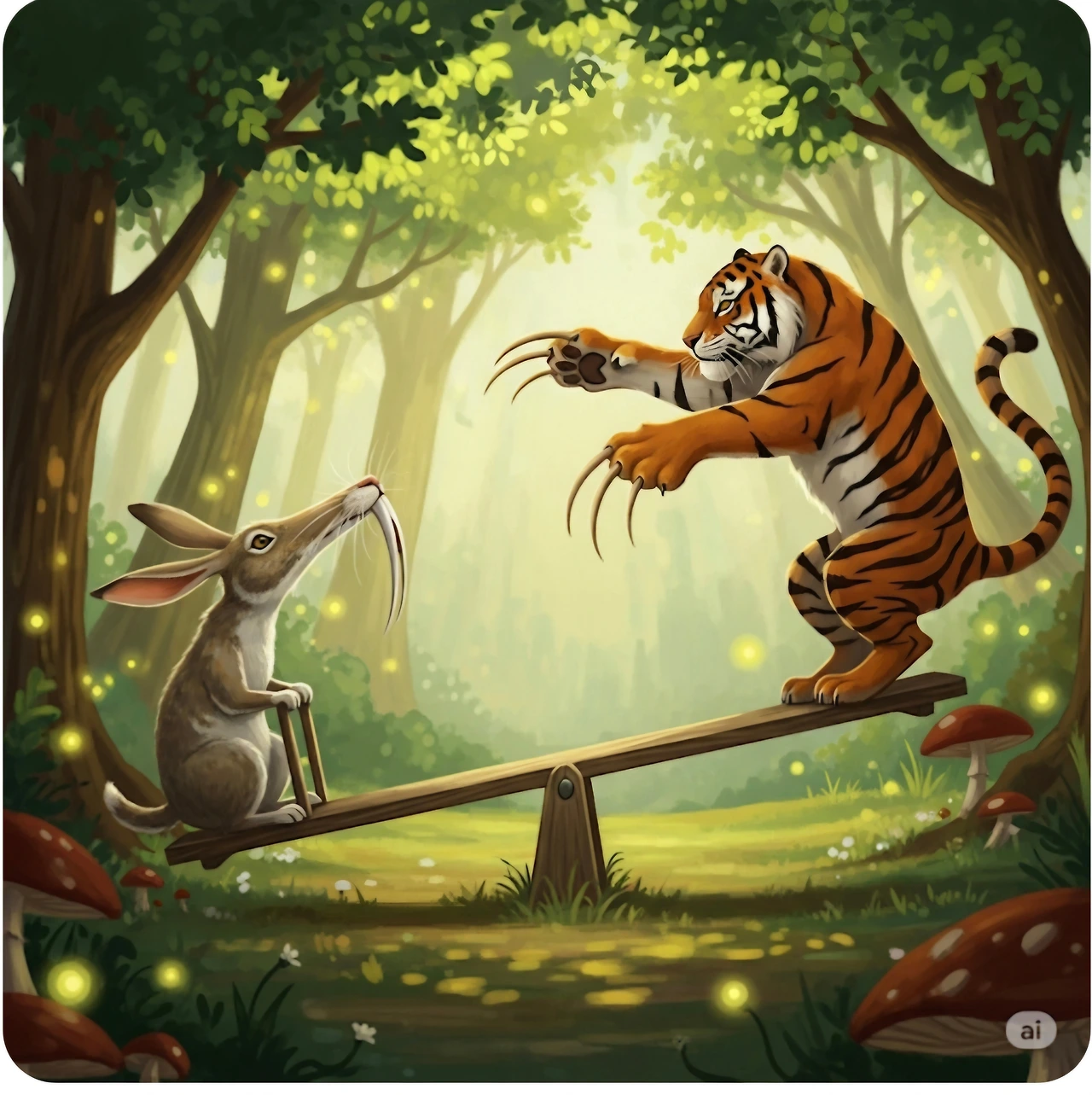 토끼가 반대편 널뛰기에 앉자 호랑이가 위로 올라갔어요.