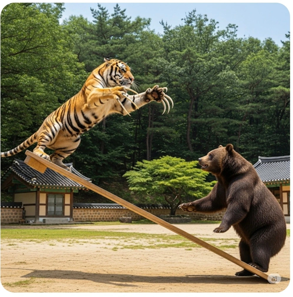 곰과 호랑이가 날뛰기 하고 있었어요.