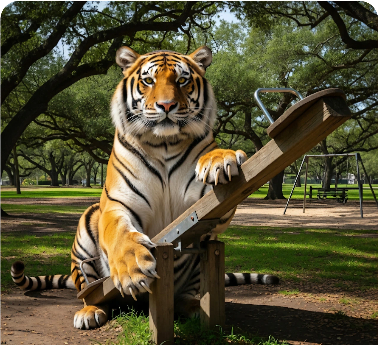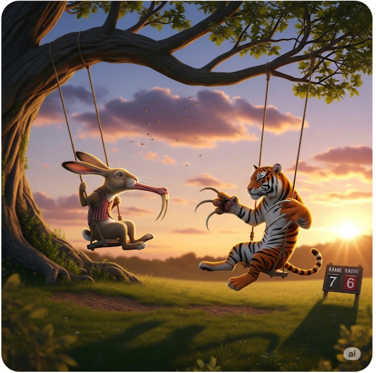 호랑이가 그네 타고 있는데 그 옆 그네에 토끼가 올라탔어요.