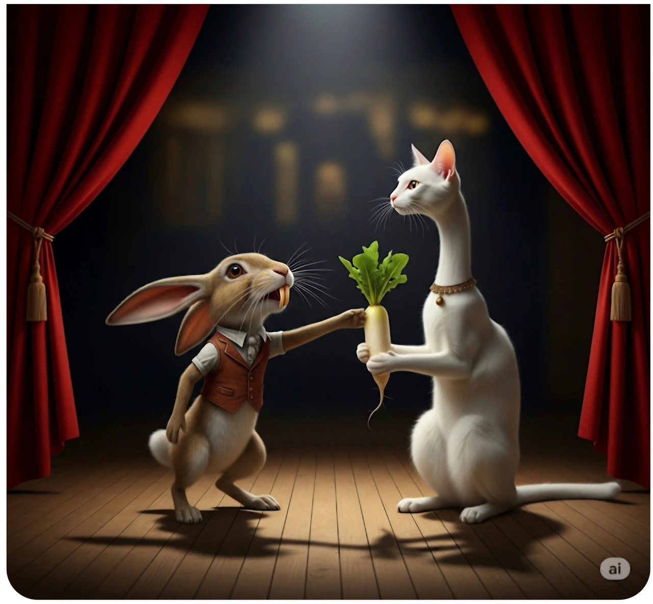 토끼가 한 마디하고 무대로 도망쳤어요.
