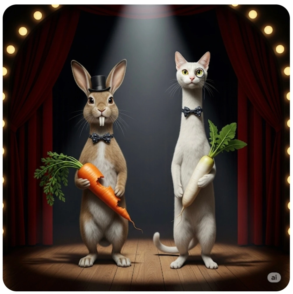 토끼와 고양이가 당근과 무를 들고 모델로 참가했어요.