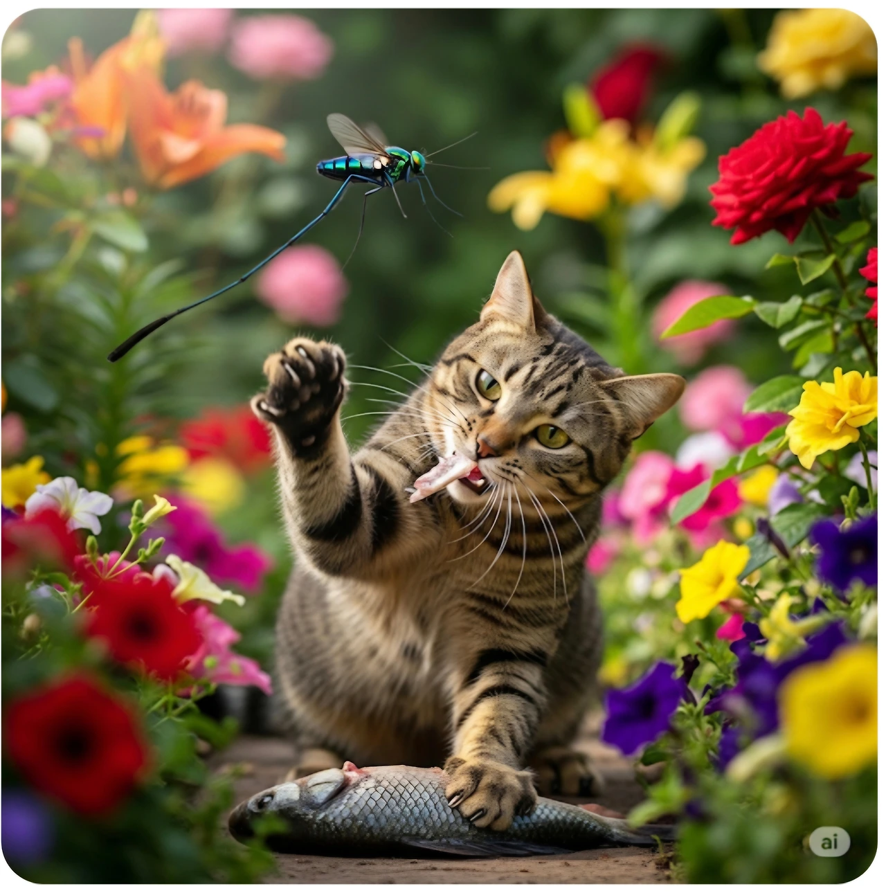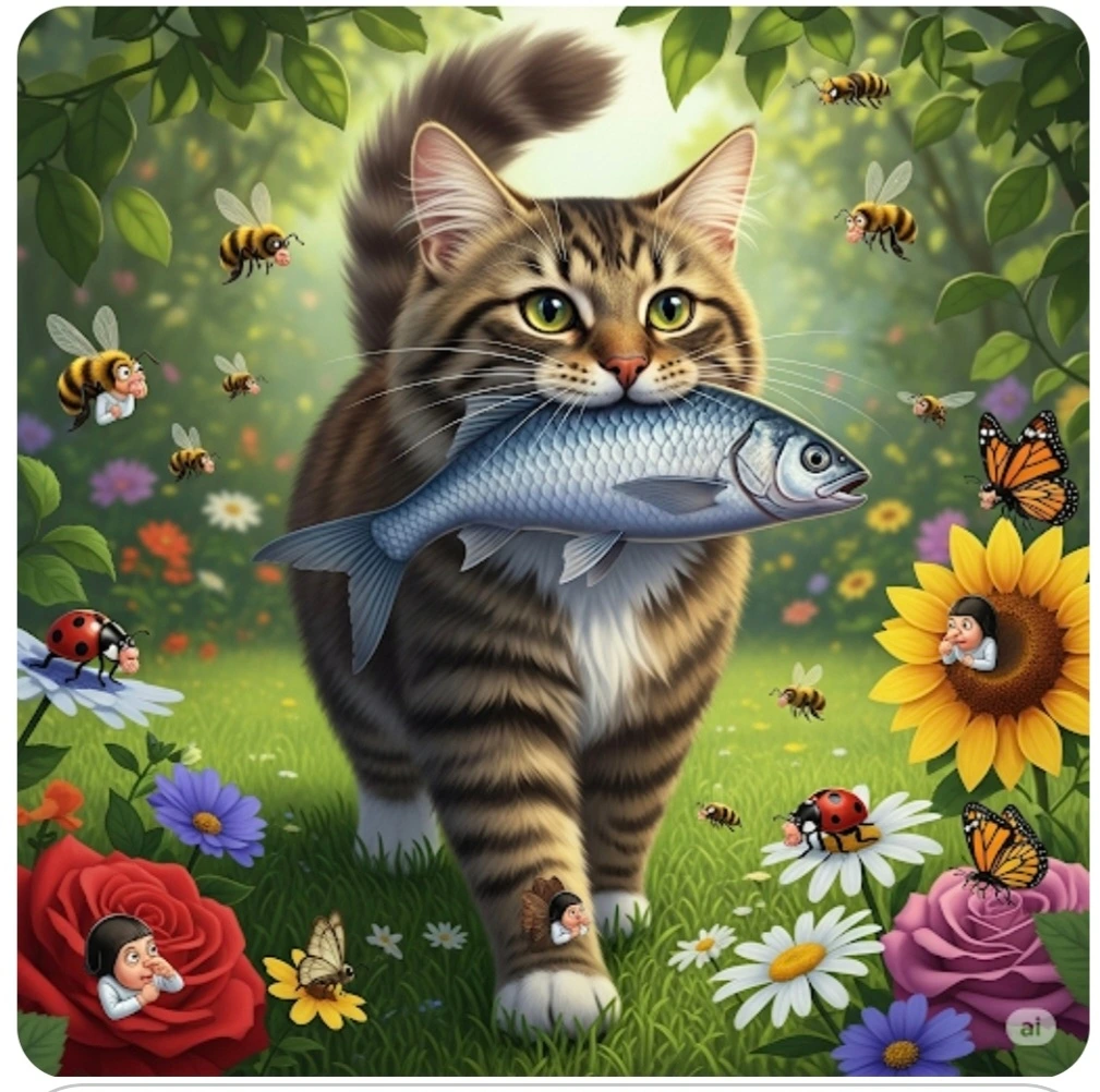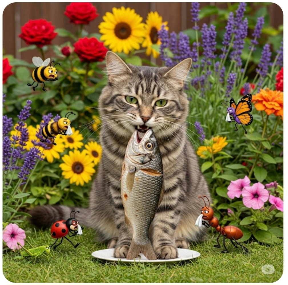 고양이는 그것도 모르고 꽃밭 한가운데서 자리 잡았어요.