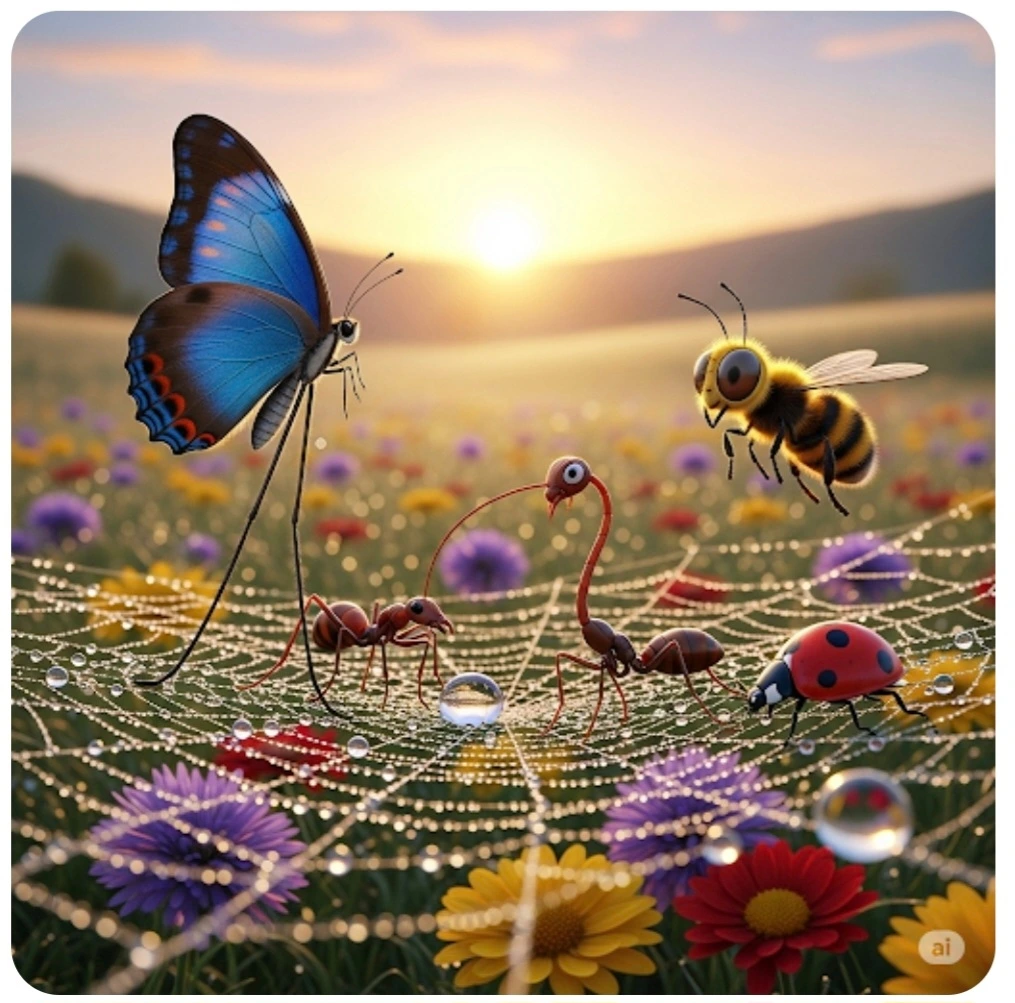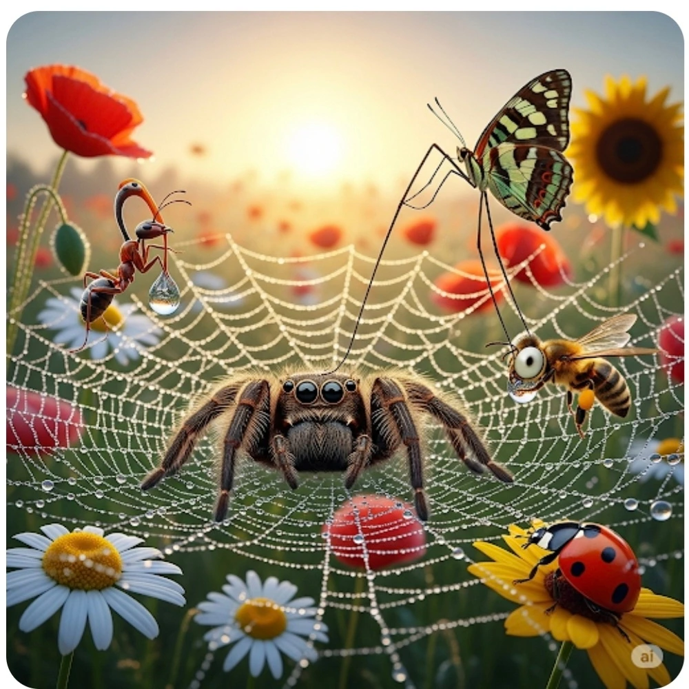 거미는 이슬 한 방울 붙잡고 친구들과 헤어졌어요.