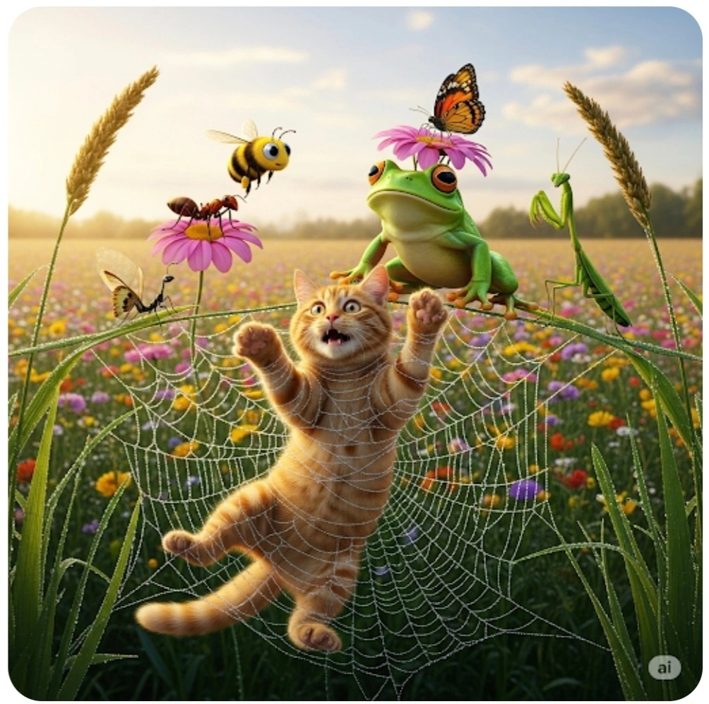 고양이가 소리치며 몸부림칠수록 거미줄이 조여갔어요.