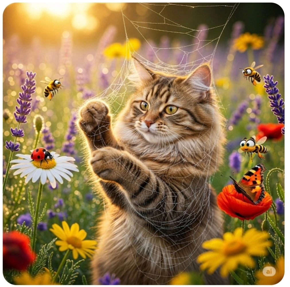 고양이는 거미줄을 하나하나 뜯었어요.