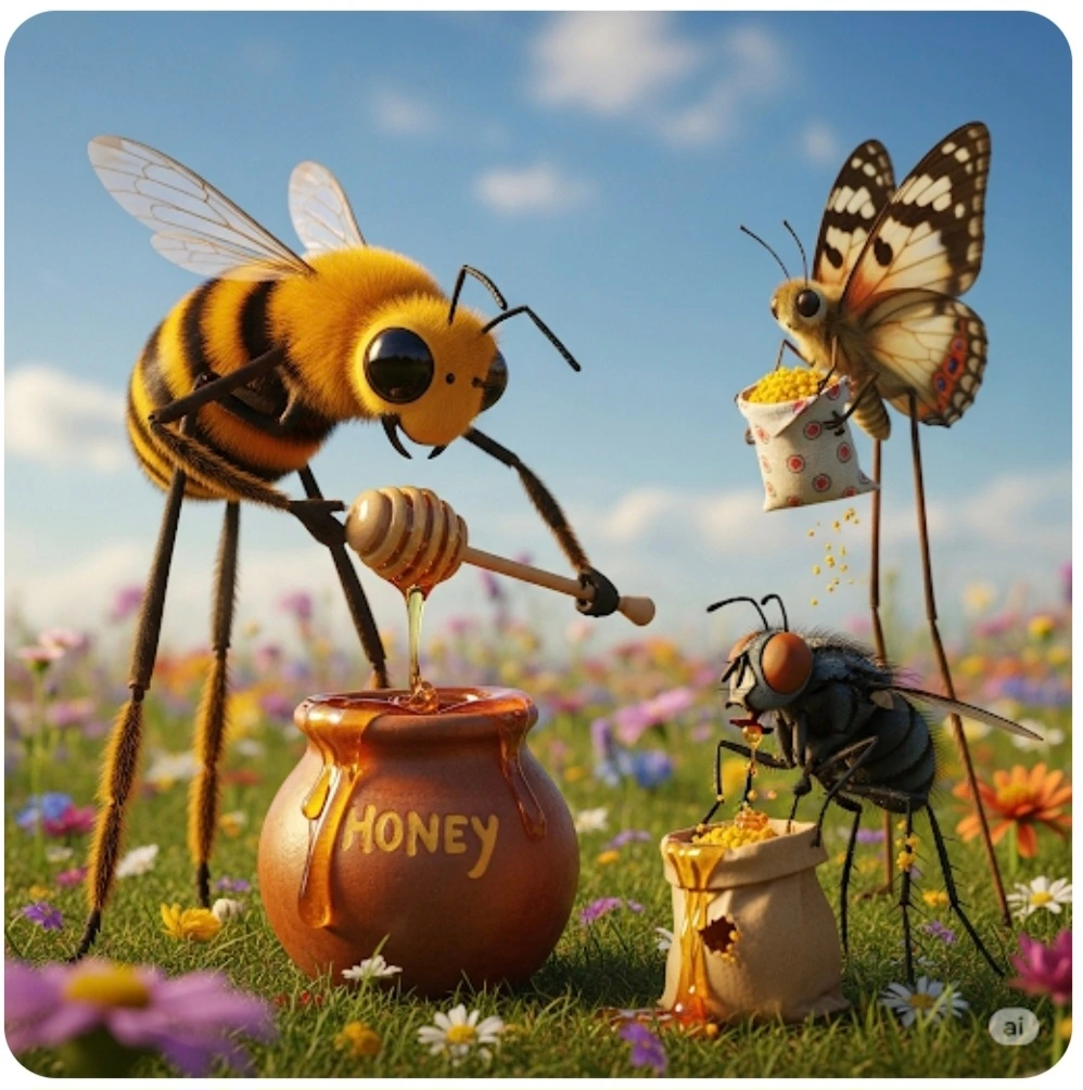 꿀벌이 말하며 꿀단지를 자랑했어요.