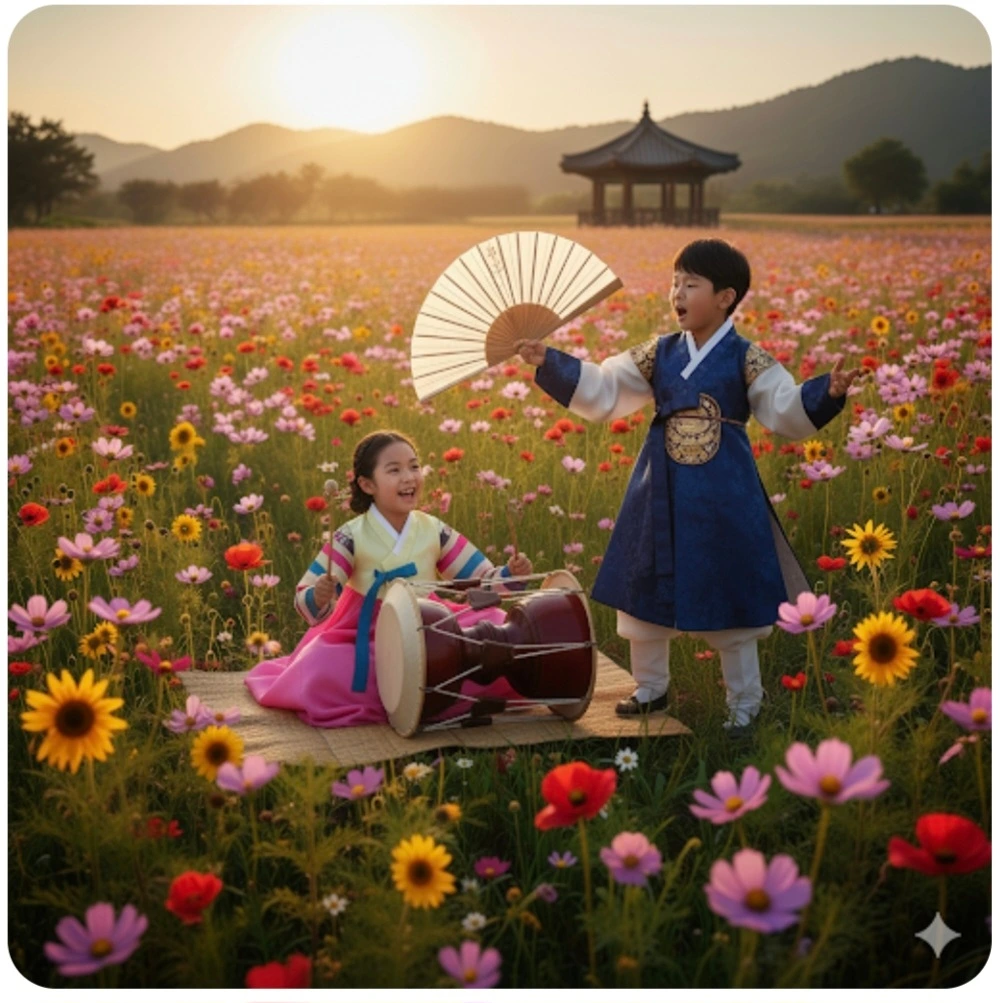 소녀는 장구 치고 소년은 춘향가를 부르고 있었어요.
