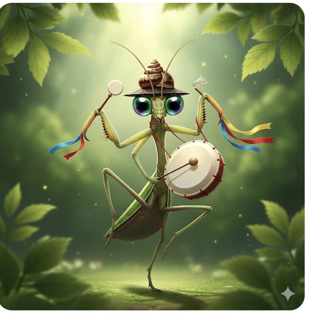 사마귀가 북을 들고 앞으로 나왔어요.