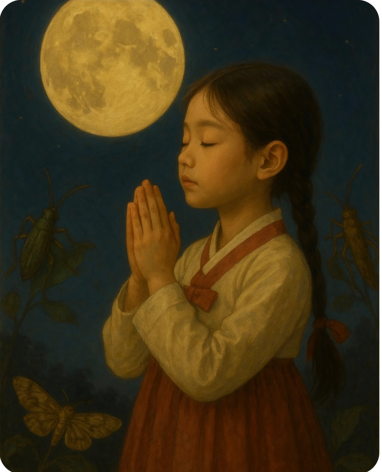 선아는 들판을 걸어다니며 달과 별들을 보고 기도했어요.