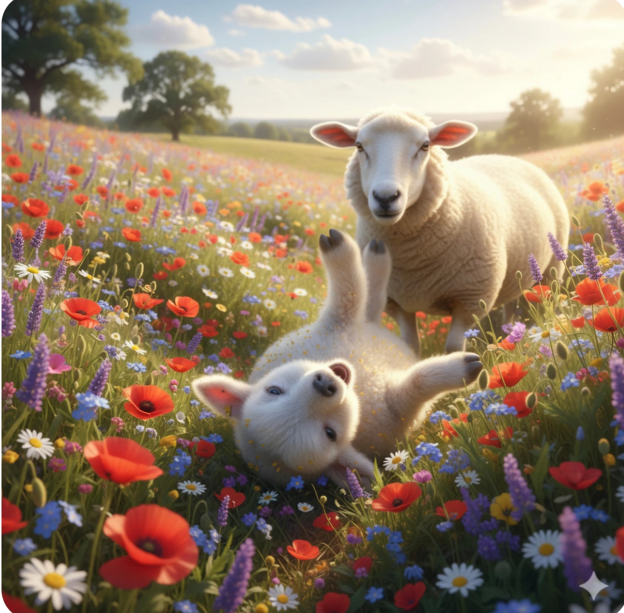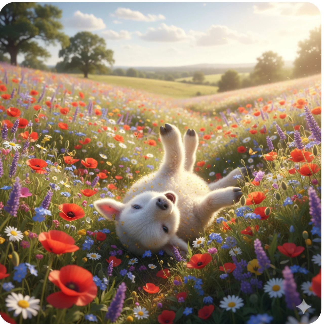 어린양은 꽃밭에서 뒹굴며 노는 게 좋았어요.