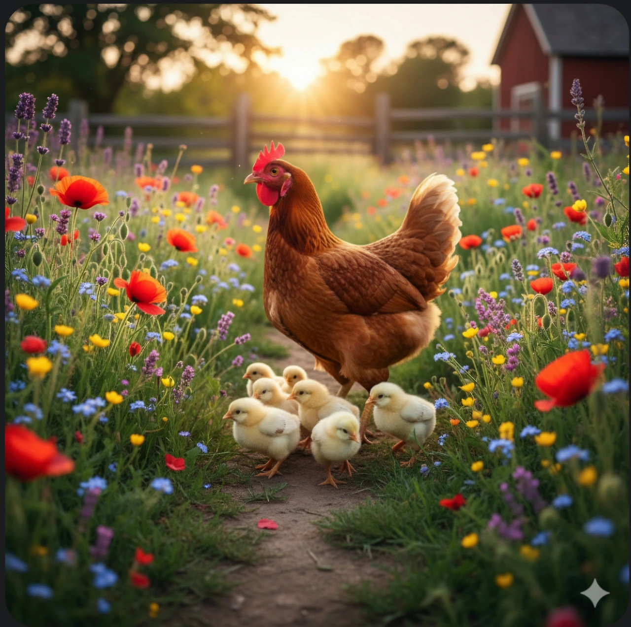 암탉은 꽃밭을 돌아다니며 먹이를 찾았어요.